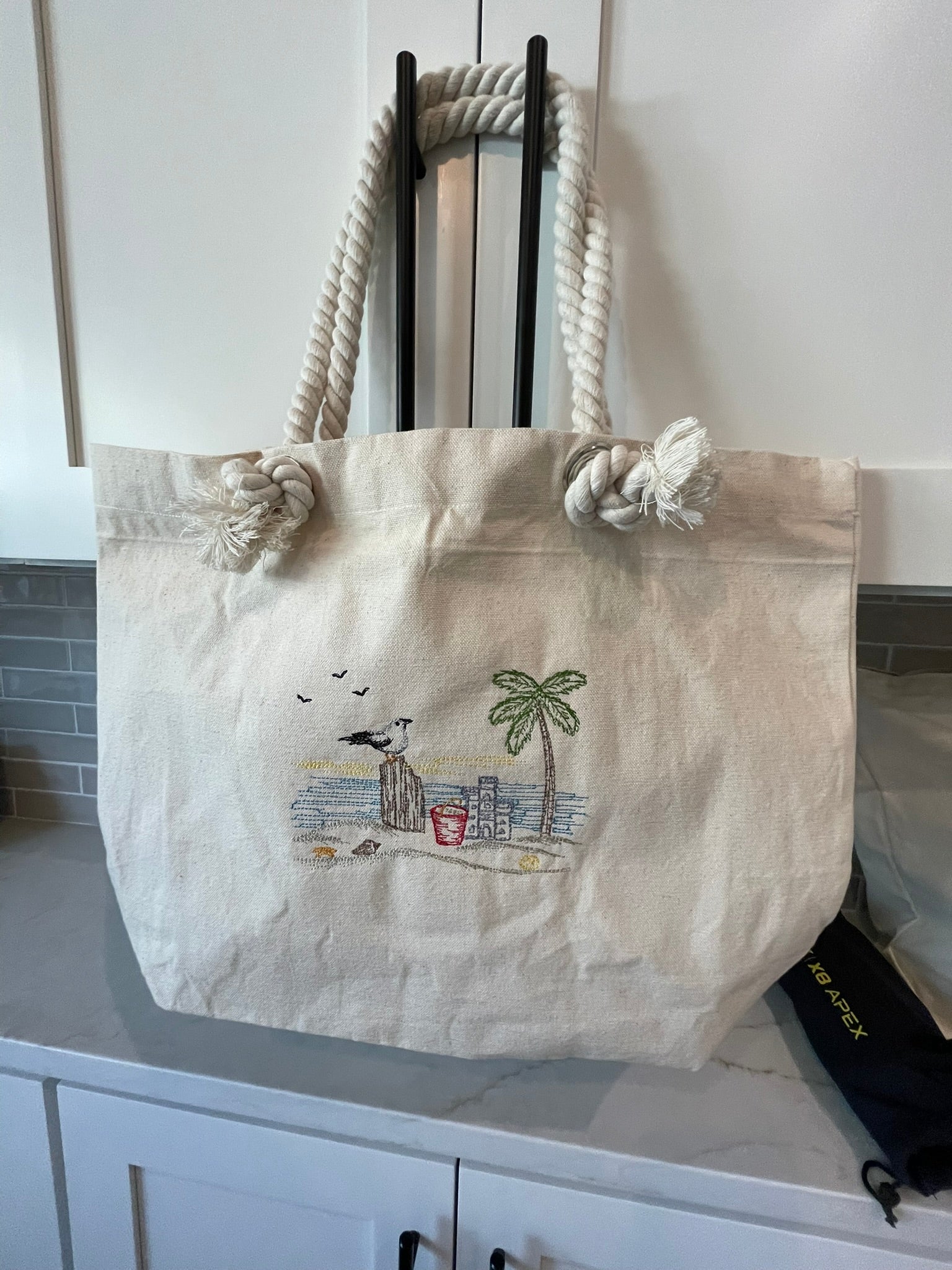 Take a little piece of paradise with you wherever you go! This adorable embroidered canvas tote features a beautiful beach scene with a serene seabird, a charming sandcastle, and a swaying palm tree—perfect for beach lovers and those who dream of the coast. Whether you're heading to the beach 🏖️, running errands 🛍️, or simply want to add a touch of summer vibes to your day 🌞, this tote is the perfect companion. Spacious, stylish, and oh-so-cute—your new go-to beach bag for all things sunny! 🌊✨